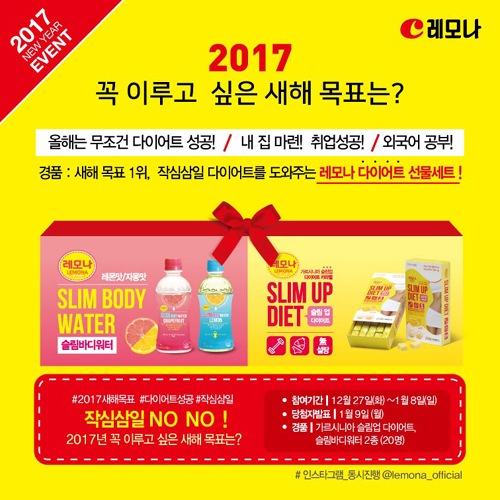 오는 2017년 1월 8일(일)까지 실시되는 이번 이벤트는 레모나 공식 채널인 ‘레모나 페이스북’과 ‘레모나 인스타그램’에서 참여 할 수 있다. 참여는 다이어트 계획이나 내 집 마련, 취업성공, 외국어 공부 등 새해에는 꼭 이루고 싶은 목표들을 댓글로 남기면 된다.