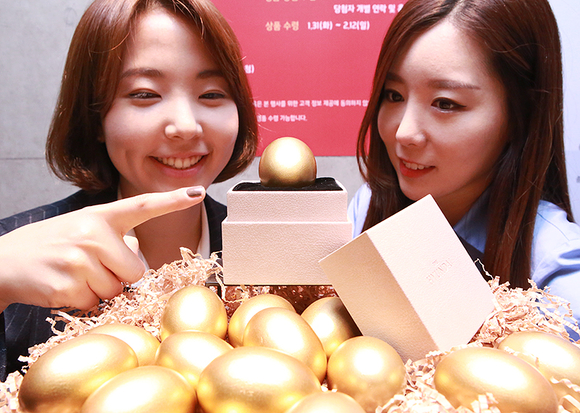 2일 오전 현대백화점 직원들이 압구정본점 5층 사은데스크 앞에 설치된 경품 '황금알'을 선보이고 있다.
