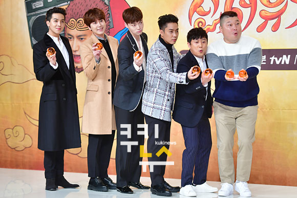 [쿠키뉴스=박효상 기자] 위너 송민호와 슈퍼주니어 규현, 배우 안재현, 가수 은지원, 개그맨 이수근, 강호동(사진 왼쪽부터)가 4일 오전 서울 영등포 타임스퀘어에서 열린 케이블 채널 tvN 예능프로그램 '신서유기3' 제작발표회에서 포즈를 취하고 있다.