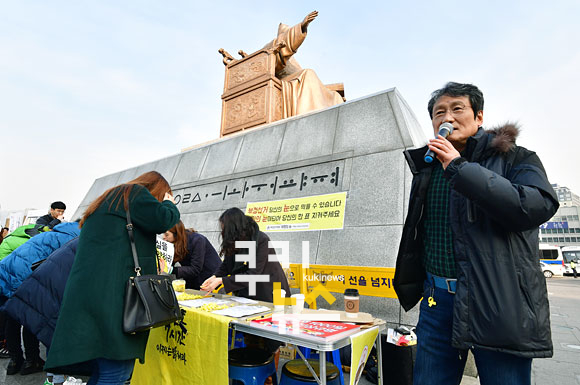 [쿠키뉴스=박효상 기자] 배우 문성근이 7일 오후 서울 종로구 광화문광장에서 열릴 예정인 '11차 범국민행동 촛불문화제'에 앞서 세월호 진상규명을 촉구하고 있다.
