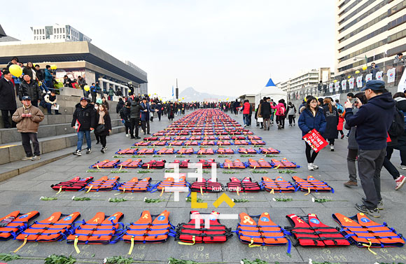 [쿠키뉴스=박효상 기자] 세월호 참사 1000일을 앞둔 7일 오후 서울 종로구 광화문광장에 희생자를 기리는 구명조끼가 놓여 있다.