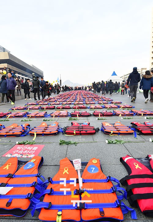 [쿠키뉴스=박효상 기자] 세월호 참사 1000일을 앞둔 7일 오후 서울 종로구 광화문광장에 희생자를 기리는 구명조끼가 놓여 있다.