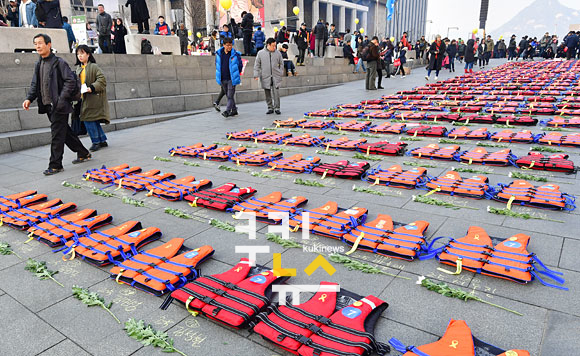 [쿠키뉴스=박효상 기자] 세월호 참사 1000일을 앞둔 7일 오후 서울 종로구 광화문광장에 희생자를 기리는 구명조끼가 놓여 있다. tina@kukinews.com