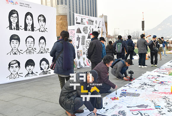 [쿠키뉴스=박효상 기자] 시민들이 7일 오후 서울 종로구 광화문광장에서 열린 '11차 범국민행동 촛불문화제' 사전행사 '길거리 붓글쓰기'에 참여해 메시지를 남기고 있다.