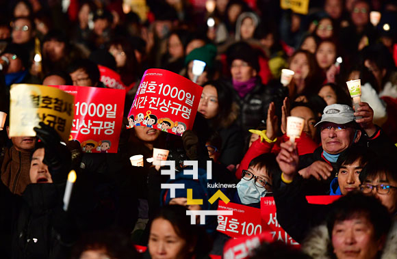 이번 촛불문화제는 오는 9일 세월호 참사 1000일을 맞아 ‘박근혜는 내려오고 세월호는 올라오라’라는 주제로 개최됐다. tina@kukinews.com