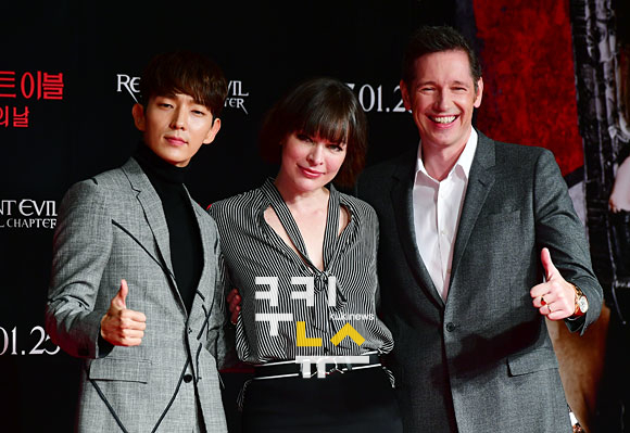 [쿠키뉴스=박효상 기자] 배우 이준기와 밀라 요보비치와 감독 폴 앤더슨이 13일 오전 서울 광화문 포시즌스호텔에서 열린 ‘레지던트 이블: 파멸의 날'(폴 앤더슨) 내한 기자회견에서 포즈를 취하고 있다.