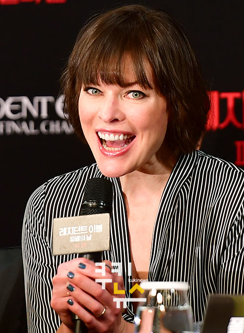 [쿠키뉴스=박효상 기자] 배우 밀라 요보비치가 13일 오전 서울 광화문 포시즌스호텔에서 열린 ‘레지던트 이블: 파멸의 날'(폴 앤더슨) 내한 기자회견에서 인사하고 있다.