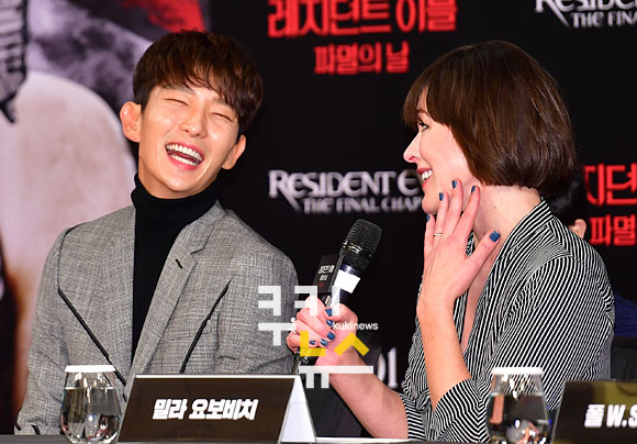 [쿠키뉴스=박효상 기자] 배우 이준기와 밀라 요보비치가 13일 오전 서울 광화문 포시즌스호텔에서 열린 ‘레지던트 이블: 파멸의 날'(폴 앤더슨) 내한 기자회견에서 인사하고 있다.