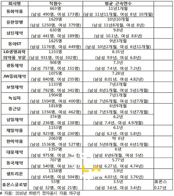 지난해 10~11월경 발표된 상위 10개 및 인지도가 높은 상장제약사의 분기보고서를 분석한 결과, 평균 근속연수가 높은 제약사는 동화약품으로 11년1개월(남성 11년11개월, 여성 8년 10개월)에 달하는 것으로 나타났다.