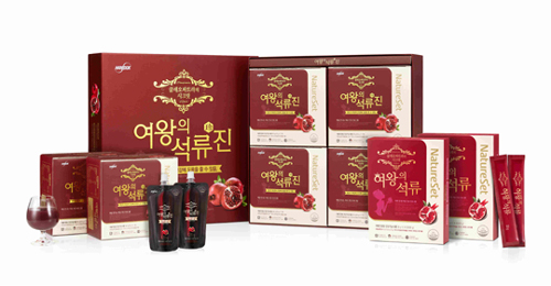 ‘클레오파트라의 시크릿-여왕의 석류 선물세트’는 파우치 음료타입의 ‘여왕의 석류 진’ 28포입과 젤리 타입의 ‘여왕의 석류’ 14포입으로 구성됐다. 기능성 석류농축액을 사용해 갱년기 여성 건강을 위한 제품이다.