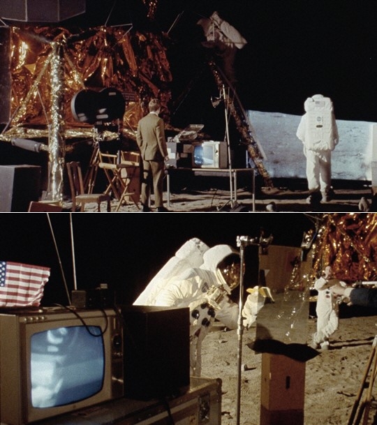 하지만 아폴로 11호의 달 착륙에 대해서는 지금까지도 미국이 소련과의 우주 개발 경쟁에서 승리하기 위해 만들어낸 조작극이라는 음모론이 나돌고 있다. 달 표면은 진공이지만 성조기가 휘날리고 있는 점, 중력이 약한 달에서 승무원들이 지구와 다를 바 없는 점프를 한 점, 달에서 찍은 사진이 두꺼운 보호장갑을 끼고 파인더도 없는 카메라로 찍었음에도 완벽한 점, 달 표면의 바위에 문자 ‘C’의 형상이 있는 점 등이 이런 음모론을 더욱 부채질했다.