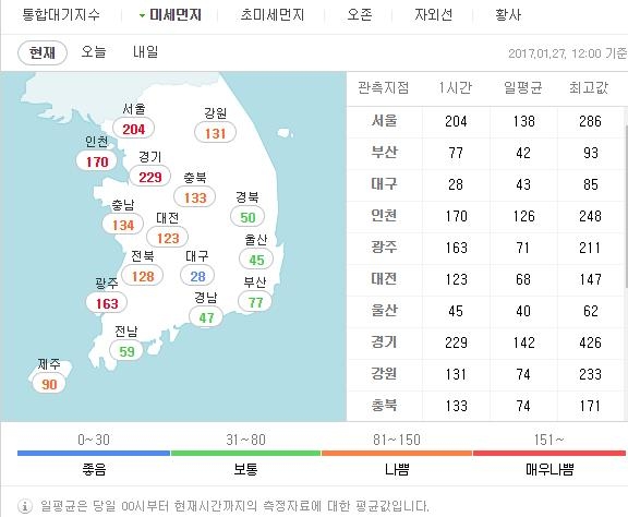 오전 10시 현재 서울 214㎍/㎥, 인천 182㎍/㎥, 경기 227㎍/㎥, 대전 109㎍/㎥, 광주 98㎍/㎥, 제주 101㎍/㎥ 등을 기록하고 있다. 미세먼지 농도가 81∼150㎍/㎥일 때는 '나쁨', 151㎍/㎥ 이상은 '매우 나쁨' 수준이다.