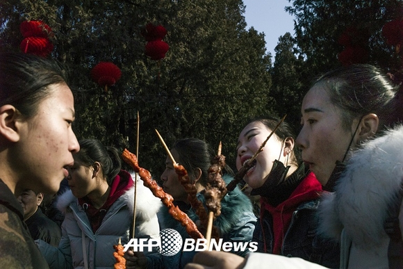 [쿠키뉴스=구현화 기자] AFP에 따르면 중국 음력설 춘절을 맞아 1일 베이징의 디탄 공원에서 중국인들이 꼬치를 먹으며 즐기고 있다.