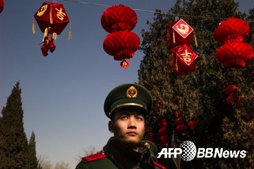 [쿠키뉴스=구현화 기자] AFP에 따르면 한 중국 공안(경찰)이1일 중국 음력설 춘절을 맞아 베이징의 디탄 공원에 장식된 조형물 아래에서 어딘가를 보고 서 있다.