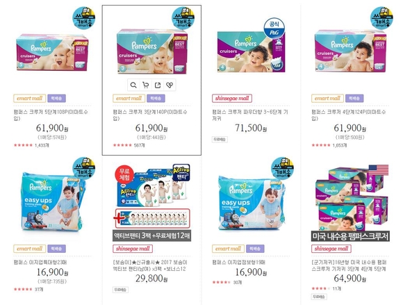 이마트몰에서는 자체 배송인 쓱배송으로 팸퍼스 크루저 3~5단계 기저귀를 6만1900원에 판매하고 있었다. 제품을 선택하고 주문을 누르니 주문 페이지로 이동해 카드를 선택할 수 있을 정도로 그대로 주문이 가능했다. 이마트는 팸퍼스 기저귀를 오프라인상에는 판매하지 않고 온라인상으로 판매하고 있었다.