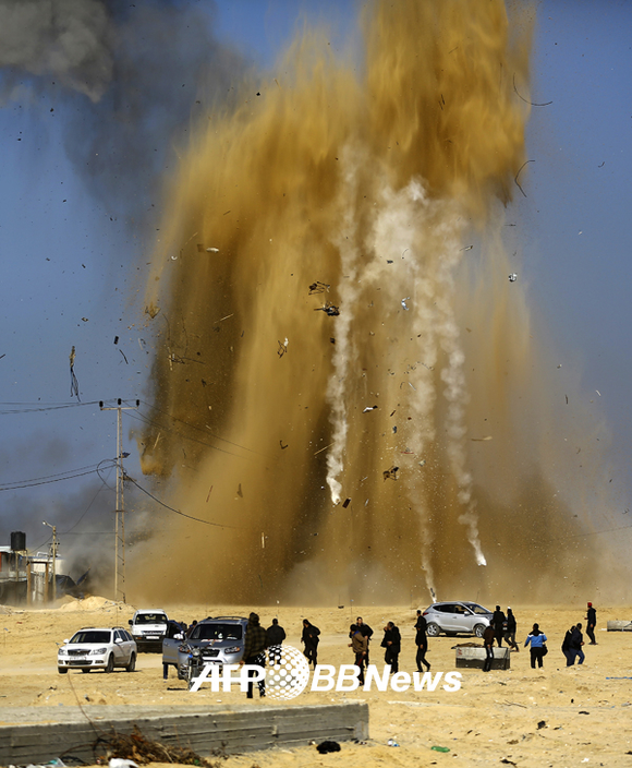 [쿠키뉴스=박효상 기자] 6일(현지시간) 이스라엘이 팔레스타인 가자(Gaza)지구 북부에 위치한 무장정파 하마스의 기지를 폭격해 주민들이 몸을 피하고 있다. 이스라엘군은 이번 폭격이 팔레스타인 측에서 먼저 발사한 포탄이 국경 부근에 떨어짐에 따라 이뤄진 것이라고 주장했다. ⓒAFP BBNews=News1