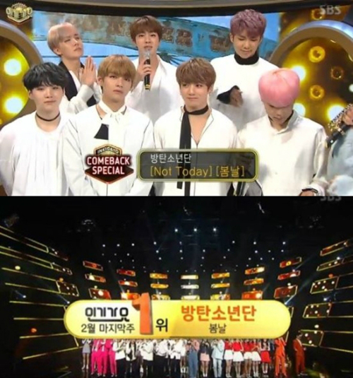 방탄소년단은 26일 낮 12시에 방송된 SBS '인기가요'에서 컴백과 동시에 신곡 '봄날'로 1위를 차지했다.
