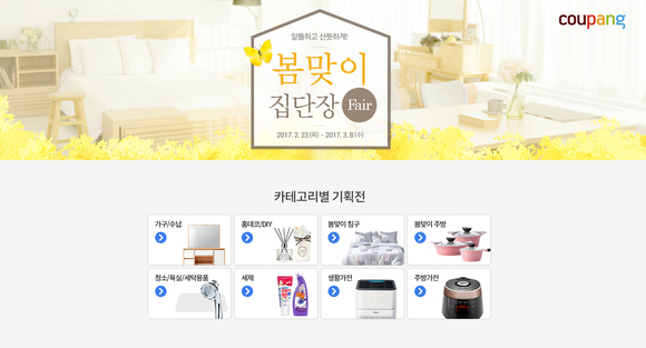 쿠팡은 이번 행사에서 집안 단장에 유용한 약 2200여개의 상품을 가구, 침구, 홈데코/DIY, 주방용품, 청소용품, 가전제품 등의 카테고리로 구성해 고객들이 손쉽게 찾아볼 수 있도록 구비했다.