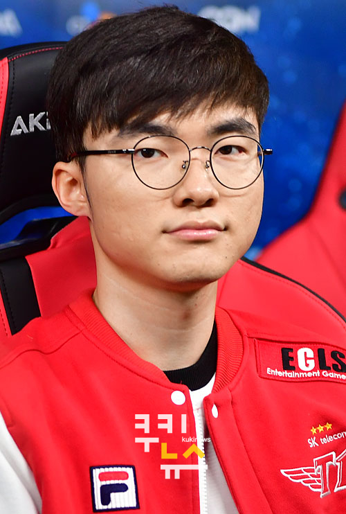 경기 시작 전 SK 텔레콤 T1의 '페이커' 이상혁이 포즈를 취하고 있다.