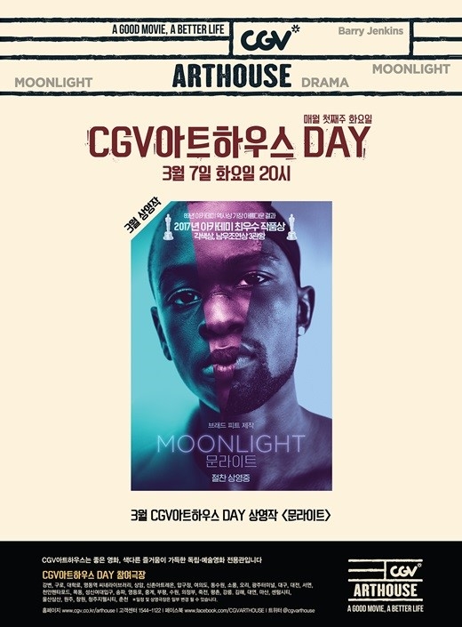 CGV아트하우스 DAY는 매월 작품성을 갖춘 화제의 독립•예술 영화 1편을 일반 상영관까지 확대 상영하자는 취지로 전국 CGV에서 상영하는 행사다. 3월 상영작으로 선정된 '문라이트'는 마이애미를 배경으로 한 흑인 아이가 소년이 되고 청년으로 성장해 가는 이야기로, 오는 7일 오후 8시경 CGV강변, 구로, 대학로, 명동역 씨네라이브러리, 상암, 신촌아트레온, 압구정, 여의도, 동수원, 소풍, 오리, 인천, 광주터미널, 대구, 대전, 서면, 천안펜타포트, 목동, 성신여대입구, 송파, 왕십리, 영등포, 중계, 부평, 북수원, 수원, 의정부, 죽전, 판교, 평촌, 강릉, 구미, 김해, 대연, 마산, 센텀시티, 울산삼산, 원주, 창원, 청주지웰시티, 춘천 등 전국 41개 극장에서 만날 수 있다.