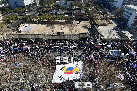 [쿠키뉴스=박효상 기자] '대통령 탄핵 기각을 위한 국민총궐기운동본부'(탄기국)은 10일 오전 10시부터 서울 종로구 재동 헌법재판소 인근인 안국역 5번 출구 앞에서 태극기집회를 열었다.