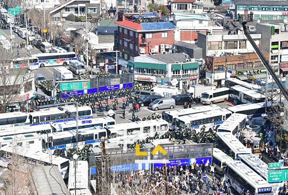 [쿠키뉴스=박효상 기자] 10일 11시 헌법재판소가 탄핵 심판 선고를 진행하는 가운데 경찰이 안국역 사거리에 차벽을 세우고 집회 참가자의 진출을 막고 있다.