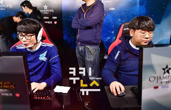 [쿠키뉴스=박효상 기자] 아프리카 프릭스의 '크레이머' 하종훈과 '투신' 박종익이 15일 오후 서울 마포구 OGN e스타디움에서 열린 2017 리그 오브 레전드 챔피언스 코리아(롤챔스) 스프링 스플릿 2라운드 SK 텔레콤 T1과의 경기에 앞서 손을 풀고 있다.