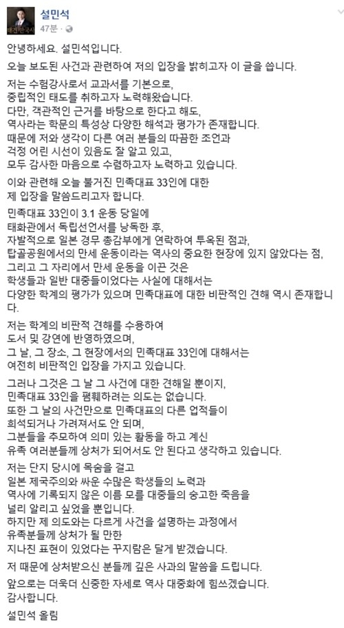 또 "당시에 목숨을 걸고 일본 제국주의와 싸운 수많은 학새들의 노력과 역사에 기록되지 않은 이름 모를 대중들의 숭고한 죽음을 널리 알리고 싶었다"며 "제 의도와 다르게 사건을 설명하는 과정에서 (민족대표 33인) 유족분들께 상처가 될 만한 지나친 표현이 있었다는 꾸지람은 달게 받겠다"고 사과했다.