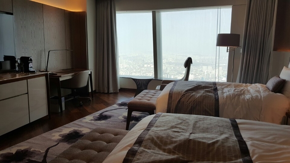 롯데물산 사무실을 둘러본 뒤 다시 내려와서 롯데의 6성급 최고급 호텔 '시그니엘'이 있는 79층으로 향했다. 보안을 이유로 오피스에서 호텔로 바로 이어지는 엘리베이터를 두지 않아 다시 1층으로 내려온 뒤 호텔에 올라가야 했다. 긴 시간을 기다려 호텔층에 들어서니 확실히 새 건물의 냄새가 났다. 호텔 관계자는 "내부 인테리어 공사는 다 되었으나 아직 소파나 짐들이 올라와야 한다"며 "아직 모든 준비가 마무리되지는 않은 상태"라고 말했다.