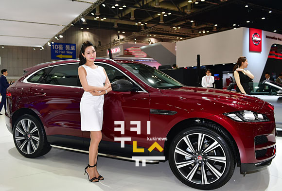 [쿠키뉴스=박효상 기자] 30일 오후 경기도 고양 킨텍스에서 '2017 서울모터쇼' 프레스데이가 열렸다. 이날 재규어 부스에서 한 모델이 F-PACE와 포즈를 취하고 있다.