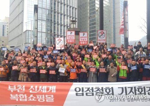 [쿠키뉴스=구현화 기자] 경기도 부천 신세계복합쇼핑몰 입점 저지 대책위원회는 6일 서울 중구 소공동 신세계 본사 앞에서 쇼핑몰 사업 철회를 촉구하는 기자회견을 열었다.