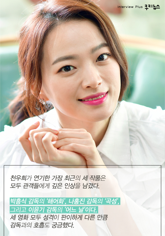 천우희가 연기한 가장 최근의 세 작품은 모두 관객들에게 깊은 인상을 남겼다. 박흥식 감독의 ‘해어화’, 나홍진 감독의 ‘곡성’, 그리고 이윤기 감독의 ‘어느 날’이다. 세 영화 모두 성격이 판이하게 다른 만큼 감독과의 호흡도 궁금했다.