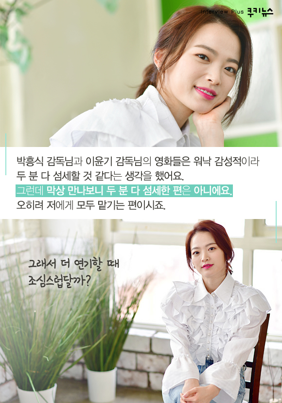 “박흥식 감독님과 이윤기 감독님의 영화들은 워낙 감성적이라 두 분 다 섬세할 것 같다는 생각을 했어요. 그런데 막상 만나보니 두 분 다 섬세한 편은 아니에요. 오히려 저에게 모두 맡기는 편이시죠. 그래서 더 연기할 때 조심스럽달까?”