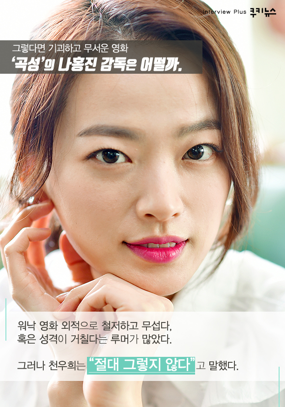 그렇다면 기괴하고 무서운 영화 ‘곡성’의 나홍진 감독은 어떨까. 워낙 영화 외적으로 철저하고 무섭다, 혹은 성격이 거칠다는 루머가 많았다. 그러나 천우희는 “절대 그렇지 않다”고 말했다.