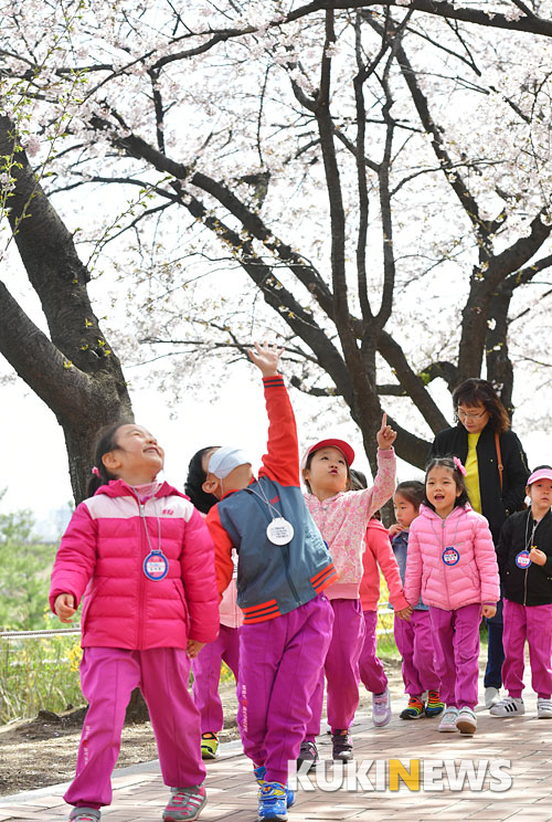 [쿠키뉴스=박효상 기자] 12일 오전 서울 여의도 윤중로를 찾은 어린이들이 활짝 핀 벚꽃을 즐기고 있다.