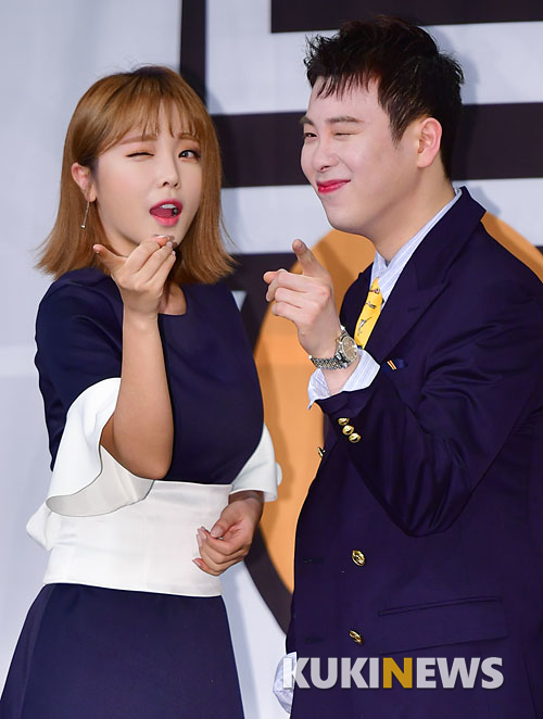 [쿠키뉴스=박효상 기자] 가수 홍진영과 블락비 피오가 12일 오후 서울 마포구 상암동에서 열린 MBC 예능 프로그램 '발칙한 동거 빈방있음' 제작발표회에 참석해 포토타임을 갖고 있다.