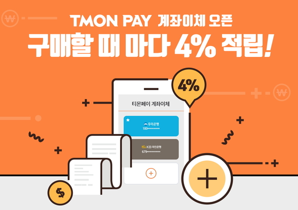 티몬은 티몬페이 계좌이체 서비스 오픈을 기념해 구매할 때마다 전체 구매금액의 4%를 적립금으로 돌려주는 프로모션을 4월 말까지 진행한다.