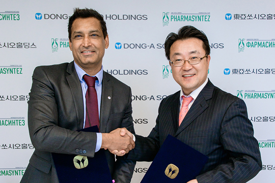 [쿠키뉴스=송병기 기자] 동아쏘시오홀딩스(대표이사 사장 한종현)는 최근 러시아 모스코바에서 러시아 제약회사 파머신테즈(대표이사 사장 비크람 싱 푸니아, Pharmasyntez)와 전략적 파트너십을 체결했다고 17일 밝혔다.