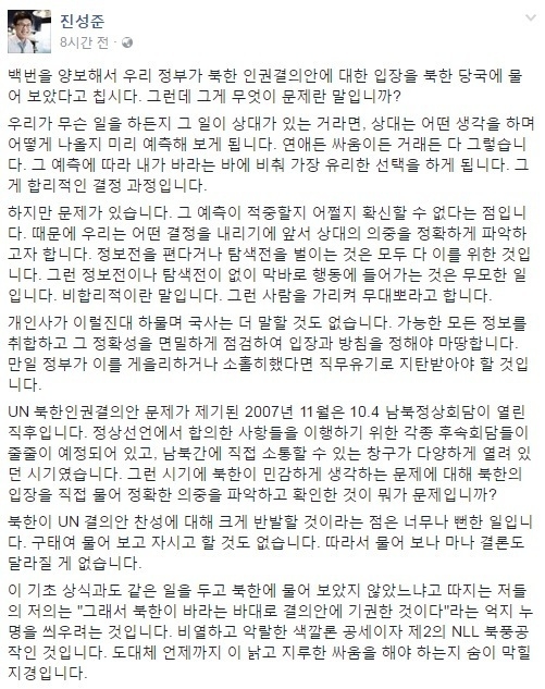 이에 관해 진 전 의원은 22일 자신의 SNS에 "북한인권결의안 문제가 제기된 2007년 11월은 10·4 남북정상회담이 열린 직후다"며 "그런 시기에 북한이 민감하게 생각하는 문제에 대해 북한의 입장을 직접 물어 정확한 의중을 파악하고 확인한 것이 뭐가 문제냐"고 말했다.