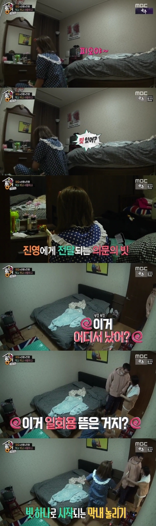21일 오후 방송된 MBC '발칙한 동거 빈방 있음'(이하 '발칙한 동거')에서는 김신영, 홍진영, 블락비 피오 3남매의 동거가 방송을 탔다. 이날 피오의 집에서 동거를 시작한 김신영과 홍진영은 잠자리에 들기 위한 준비를 했다. 그러던 중 홍진영은 머리를 말리며 피오에게 "빗 있냐. 빗을 깜빡하고 안 가지고 왔다"라며 빗을 요청했다.
