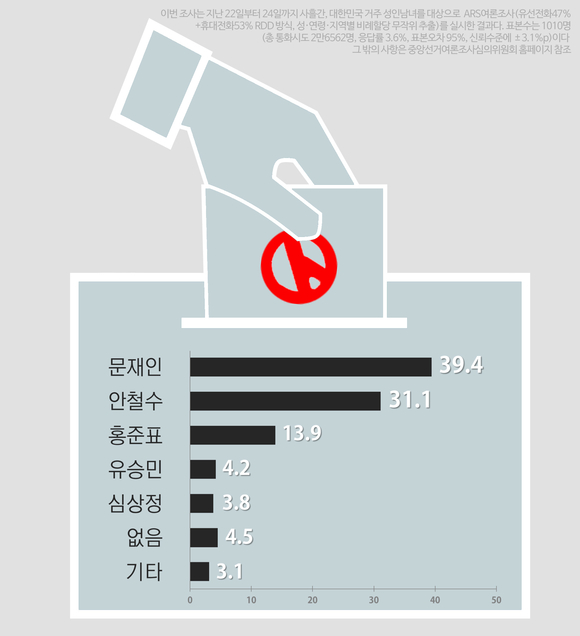25일 쿠키뉴스의 의뢰로 조원씨앤아이가 조사, 발표한 여론조사 결과에 따르면 전체 응답자 중 39.4%가 문 후보를 차기 대통령으로 꼽았다. 안 후보 31.1%, 홍준표 자유한국당(한국당)대선후보 13.9%, 유승민 바른정당 대선후보 4.2%, 심상정 정의당 대선후보 3.8%, 없거나 잘 모르겠음 7.6%로 조사됐다.