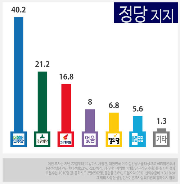 이날 함께 발표된 정당 지지율은 민주당 40.2%, 한국당 16.8%, 국민의당 21.2%, 바른정당 5.6%, 정의당 6.8%, 지지정당 없거나 잘 모르겠음 9.3%로 집계됐다.