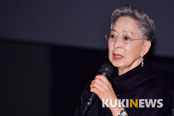 [쿠키뉴스=박효상 기자] 배우 김지미가 28일 오후 전북 전주시 영화의 거리에서 열린 제18회 전주국제영화제(JIFF) 영화 '비구니' 관객과의 대화에 참석해 인사하고 있다.