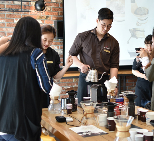 이날 행사에서는 커피가 만들어지는 일련의 과정에 대한 이론강연을 듣고, 바리스타 파우치(드립커피), 캡슐 커피, 브루잉 케맥스, 에러로 프레스 등 각각의 추출방법에 대한 실습과정을 직접 체험했다. 또 동국제약이 여성 갱년기 질환에 관한 ‘중년여성의 건강 관리법’ 정보를 제공 시간도 가졌다.