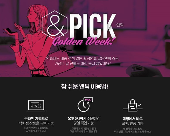 AK몰은 황금연휴 기간에도 가정의 달 선물을 구매할 수 있도록 ‘앤픽(&PICK)’ 서비스를 운영하고 있다. 5월8일까지 앤픽 서비스 제품을 주문하면 AK플라자 구로본점, 수원AK타운점, 분당점, 평택점 등 4개 점에서 배송 걱정 없이 바로 수령이 가능하다. 오후 5시 이전 주문의 경우 당일 수령할 수 있으며, 매장에서 바로 교환 및 반품이 가능하다.
