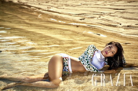 인도네시아 발리에서 촬영한 이번 화보에서 유빈은 대담한 의상으로 탄탄한 몸매를 과시했다.