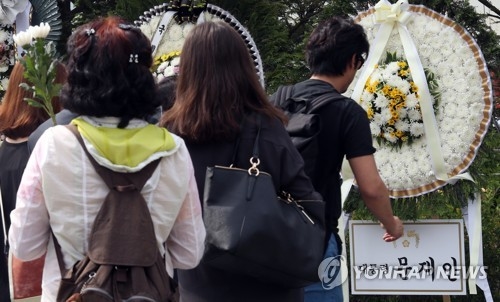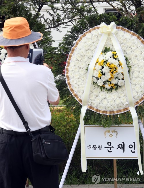 봉화마을 찾은 시민이 문재인 대통령 조화를 촬영하고 있다.