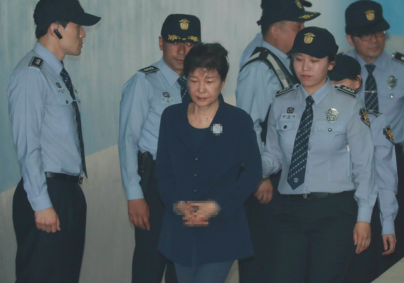[쿠키뉴스=박태현 기자] 삼성 등 대기업으로부터 총 592억원의 뇌물을 받거나 요구한 혐의를 받고 있는 박근혜 전 대통령이 23일 오전 서울 서초중앙로 서울중앙지방법원에 첫 공판을 받기 위해 피고인으로 출석했다.