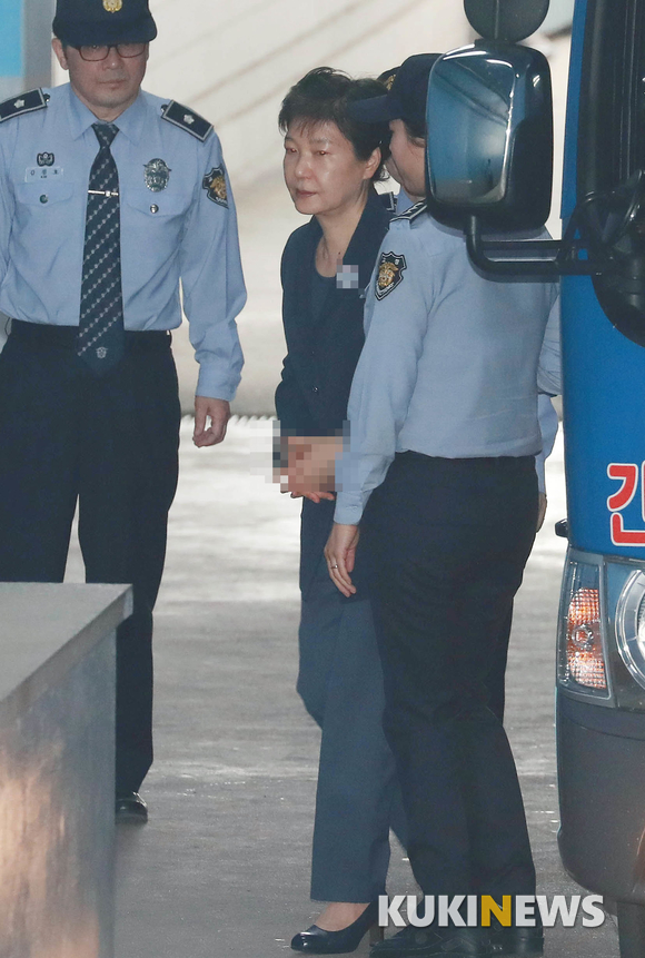 [쿠키뉴스=박태현 기자] 삼성 등 대기업으로부터 총 592억원의 뇌물을 받거나 요구한 혐의를 받고 있는 박근혜 전 대통령이 23일 오전 서울 서초중앙로 서울중앙지방법원에 첫 공판을 받기 위해 피고인으로 출석했다.