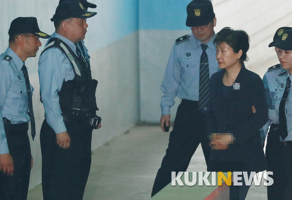 [쿠키뉴스=박태현 기자] 삼성 등 대기업으로부터 총 592억원의 뇌물을 받거나 요구한 혐의를 받고 있는 박근혜 전 대통령이 23일 오전 서울 서초중앙로 서울중앙지방법원에 첫 공판을 받기 위해 피고인으로 출석했다.